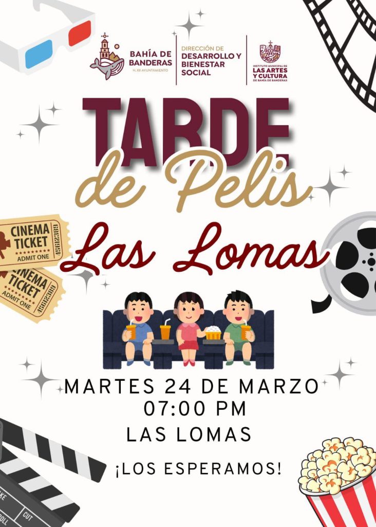 Con el objetivo de fomentar la convivencia y el acceso a actividades recreativas, el Gobierno Municipal de Bahía de Banderas llevará a cabo una “Tarde de Pelis” este martes 24 de marzo en punto de las 19:00 horas en la comunidad de Las Lomas.
